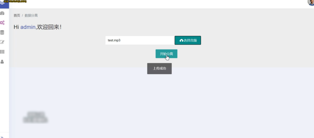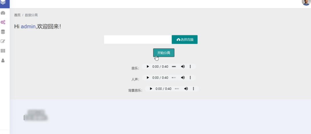该功能是整个系统中最为主要的功能,该功能可以在文本框中选择音频,当选择了本地的音频后,系统会进行音频的上传操作,在上传之后可以通过点击开始分离来对上传的音频进行分离操作。在分离之后,会形成三个音频内容,分别为原始的音频,背景音乐的音频以及人声的音频