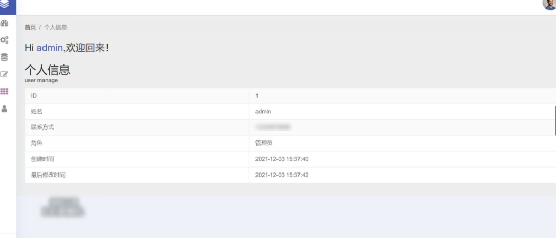 在管理员的权限内通过点击以图标显示的菜单栏,可以实现个人信息的查看,当进入到个人信息中,可以看到个人的ID、用户名及角色信息等内容。