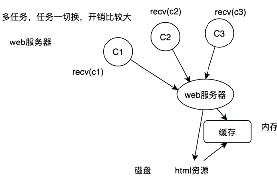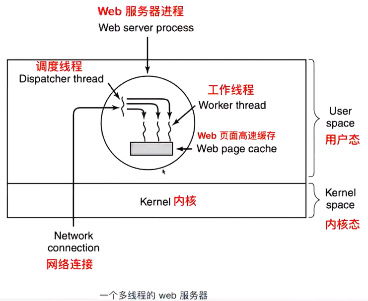 - 工作线程:共享Web页面的高速缓存,不用直接去访问内核