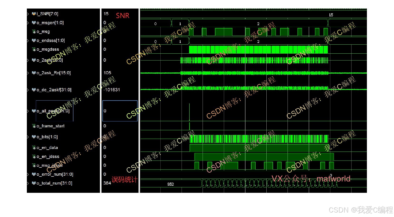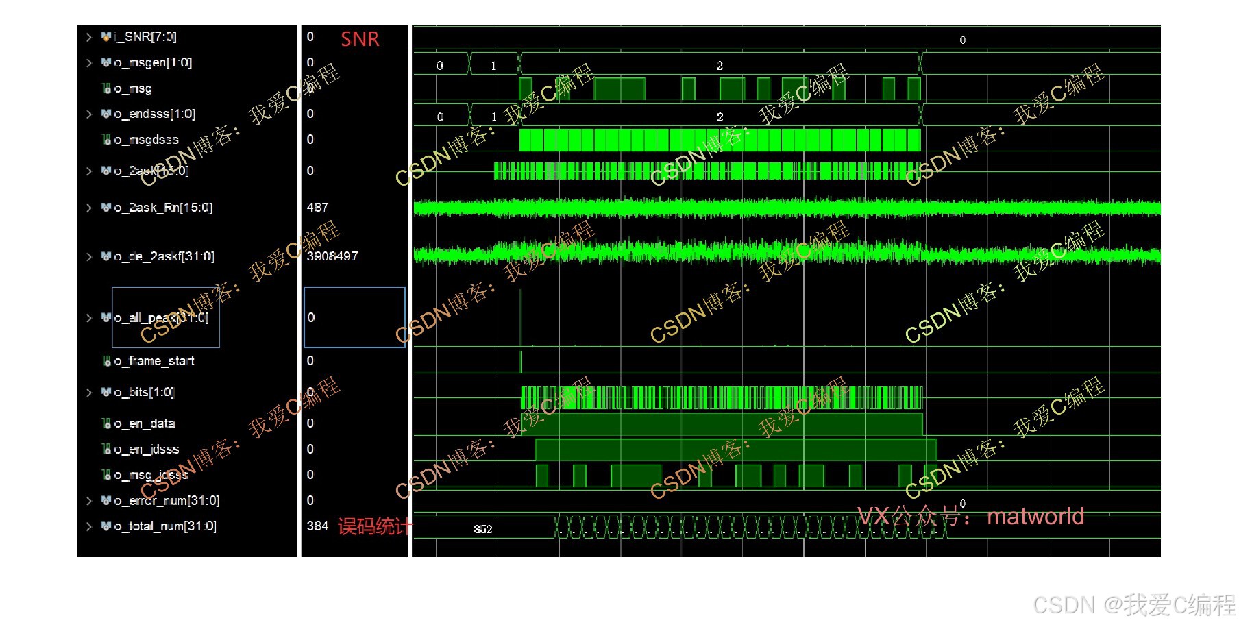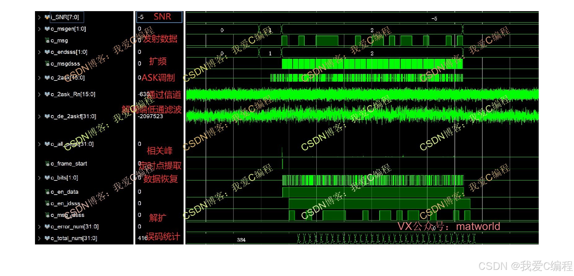基于FPGA的2ASK通信链路实现,系统包括2ASK调制模块,2ASK相干解调模块,AWGN信道模块,误码统计模块,数据源模块,基于相关峰提取的帧同步和定时点提取模块,扩频解扩等。