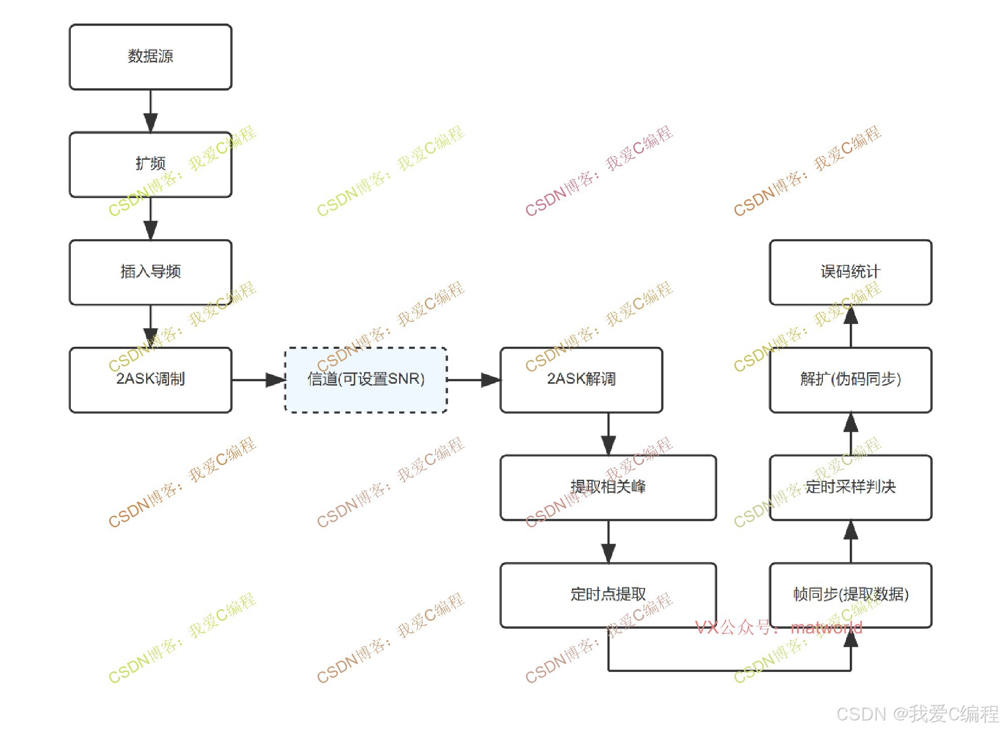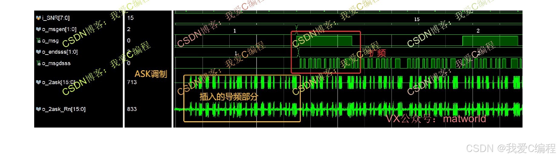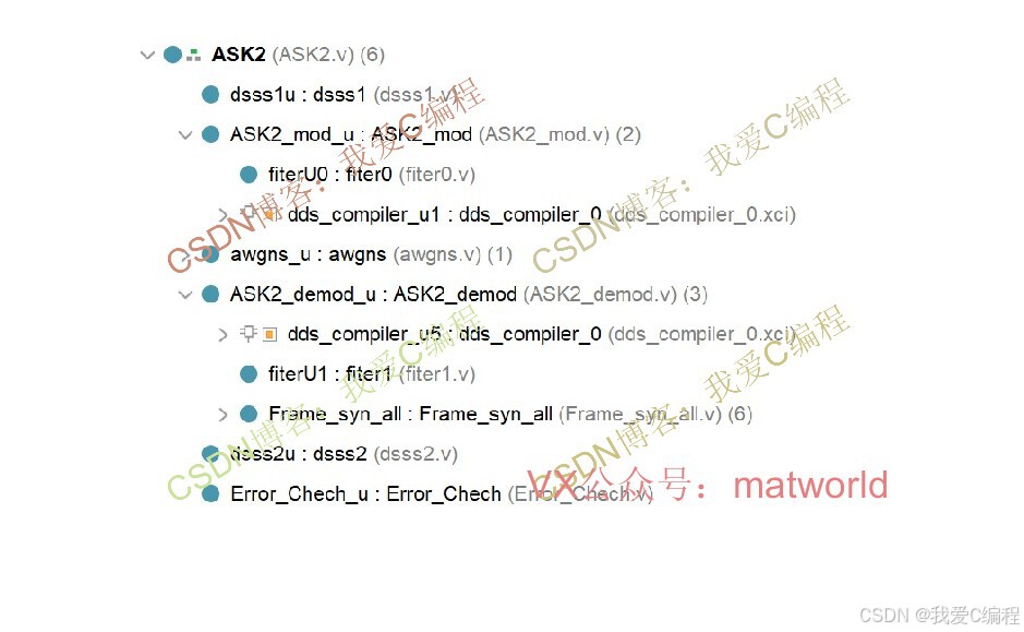 1\]程晓畅,苏绍景,王跃科,等.伪随机码超声扩频测距系统设计与算法\[J\].测试技术学报, 2007, 21(1):5.DOI:10.3969/j.issn.1671-7449.2007.01.016. \[2\]杜勇.数字调制解调技术的MATLAB与FPGA实现\[M\].电子工业出版社,2014. ## 6.完整算法代码文件获得 **完整程序见博客首页左侧或者打开本文底部GZH名片** **(V关注后回复码:X113)** **(或者回复:ASK扩频)** **V**