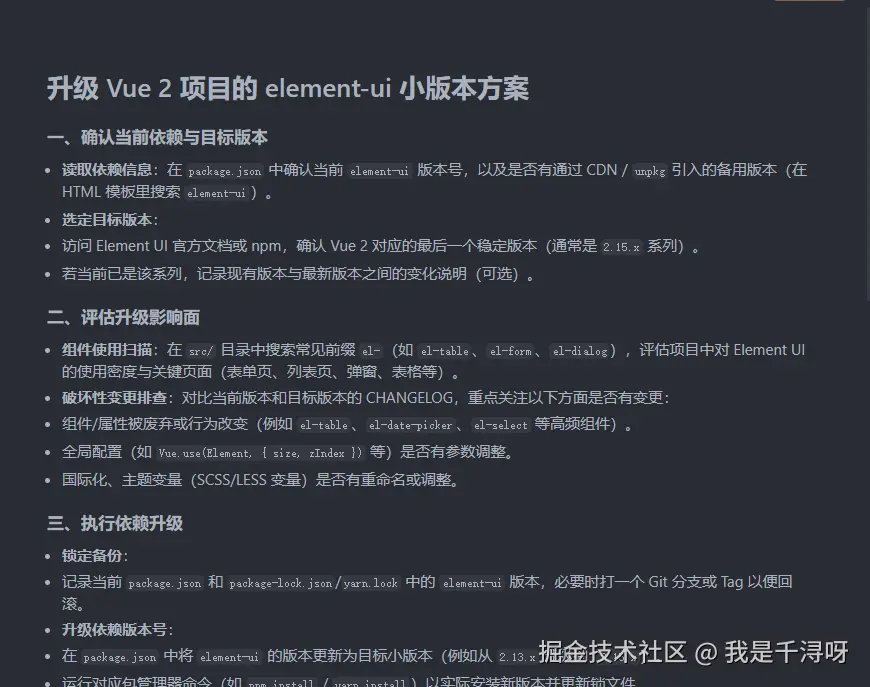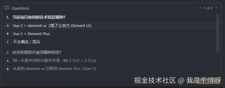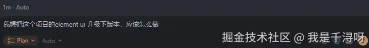 Plan 模式像个大号的Ask模式,我只会在大型功能开发、复杂重构和项目初始化时使用。他会先问你,如果我想把项目的element ui升级下版本,直接问: