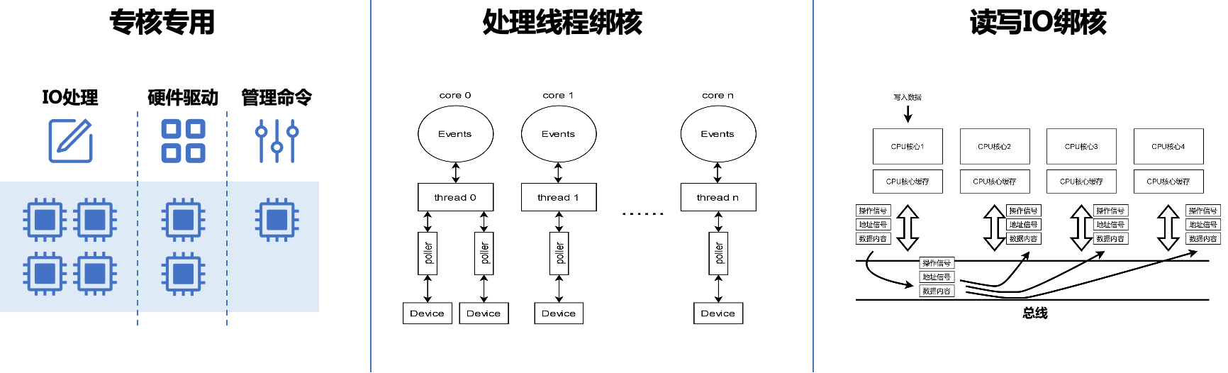 它首先引入了"绑核设计",实施专核专用策略。系统将处理线程、读写I/O、硬件驱动等关键任务严格绑定至特定的CPU核心,确保每个I/O都在固定的核心上执行。这种设计不仅规避了线程在不同CPU间迁移造成的上下文震荡,更极大提升了CPU缓存的局部性,使得重复访问的数据能够大概率命中缓存,大幅降低了指令同步的开销。