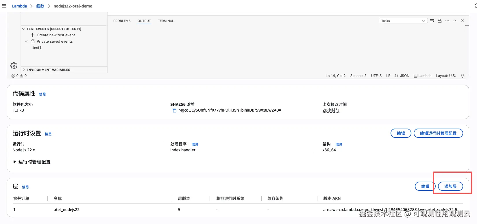 在 Demo 函数中添加 Layer,选择指定一个 ARN ,将刚才的 ARN 复制进去,点击「添加」。