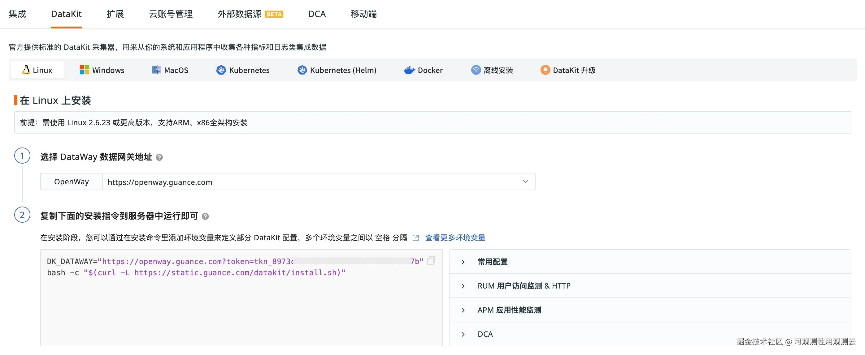 进入观测云控制台 -「集成」-「DataKit」-「Linux」复制命令安装 DataKit 。