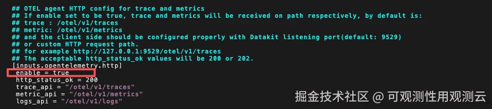编辑 opentelemetry 配置文件,修改如下部分,添加 enable = true ,然后保存。