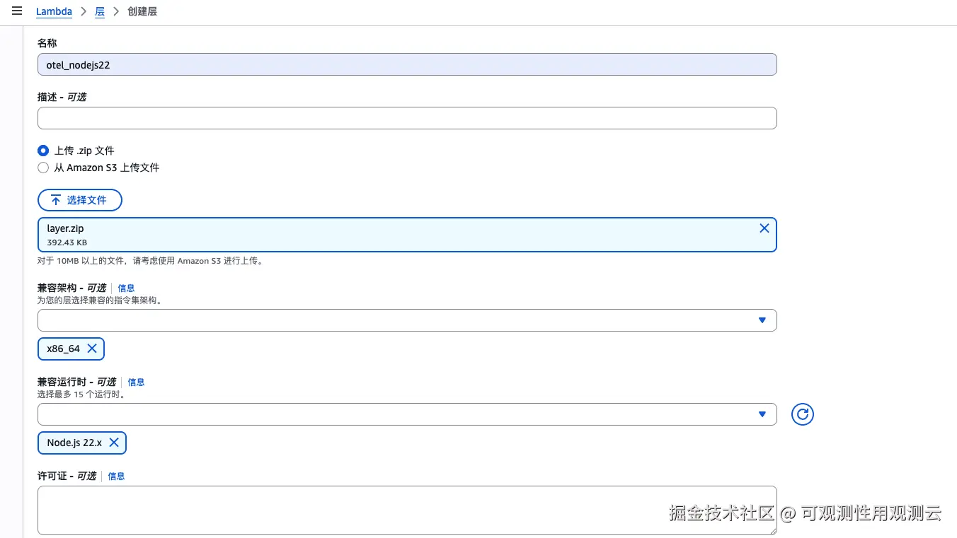 在 AWS 控制台 Lambda 进入「layer」,新建一个 Layer,选择上传 .zip 文件方式上传刚才生成的 layer.zip 文件,架构选择 x86、运行时选择 nodejs。创建好后复制 ARN 。