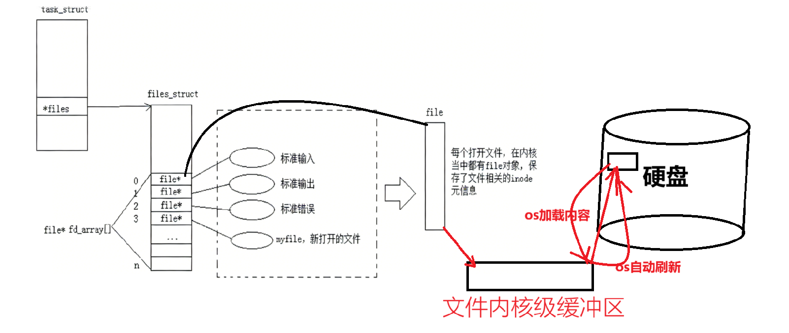 细节2:客观上,就是写给了file对应的文件内核缓冲区->OS->自主刷新->磁盘