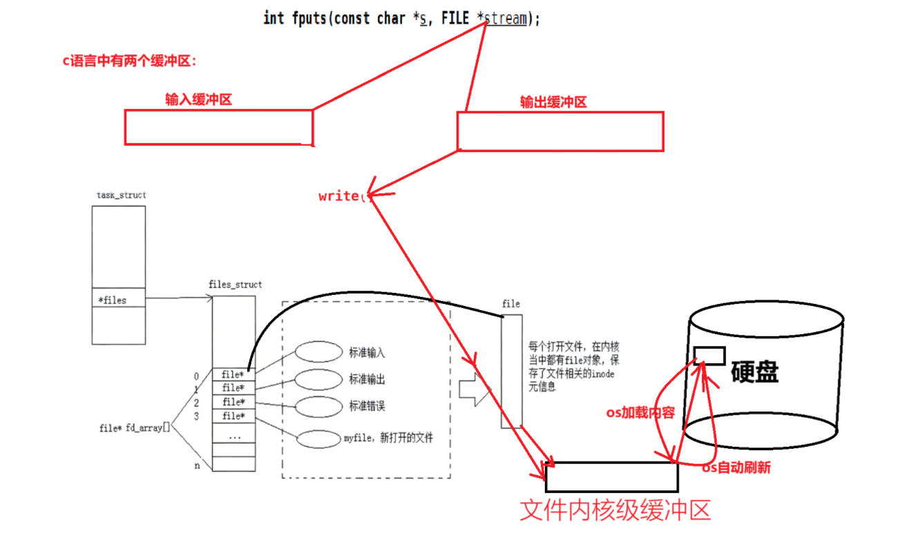 fputs函数的底层是调用了write系统调用级函数,但是**fputs函数会先将用户的数据存储在输入缓冲区中,当缓冲区满了或者满足一定的条件后,**会将输入缓冲区中的内容传给write函数,然后交操作系统来处理。