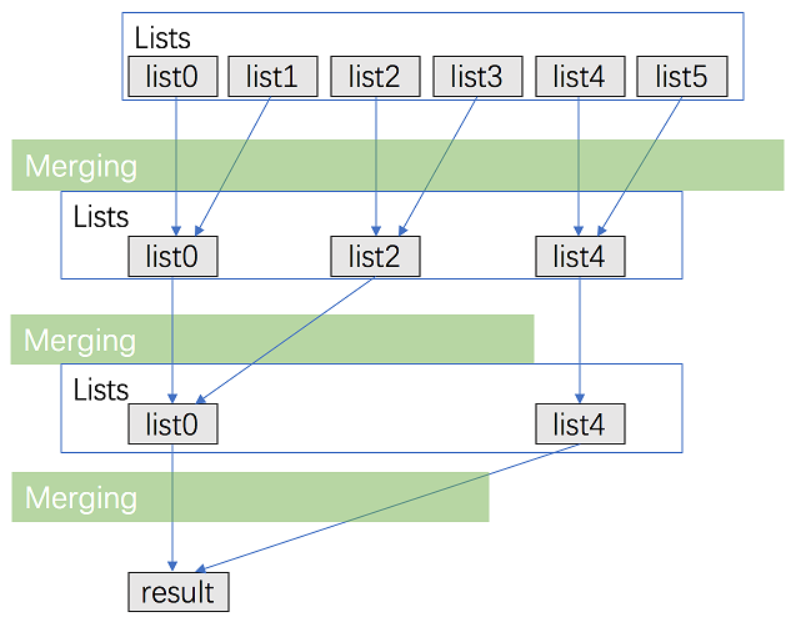 // - merge(lists, l, mid): 负责合并左半部分,返回左边合并好的大链表