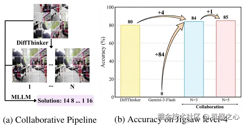 - 协同推理(Collaborative Reasoning) DiffThinker 还可以与 MLLM 合作。它生成多个候选视觉解,再由 MLLM 进行逻辑验证。实验显示,这种「DiffThinker 生成 + MLLM 验证」的组合,性能实现「1+1>2」,超越了任何单一模型。