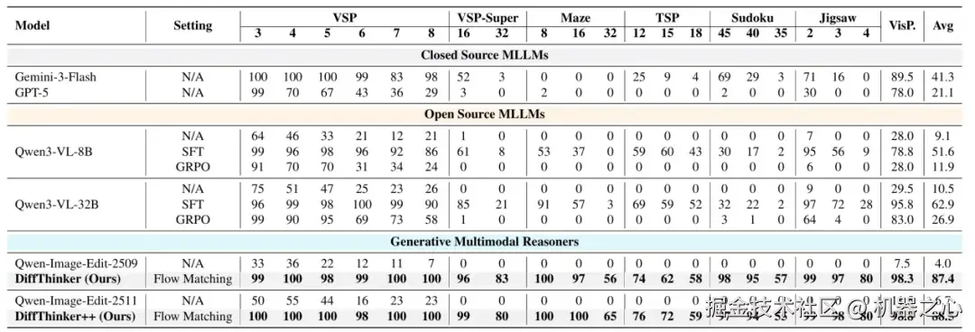 实验结果令人惊讶:在包含长程规划、组合优化、约束满足、空间推理等 7 项视觉中心的复杂任务中,DiffThinker 的表现显著优于包括 GPT-5 (+314.2%) 和 Gemini-3-Flash (+111.6%) 在内的顶尖闭源模型,以及经过相同数据微调的 Qwen3-VL-32B 基线 (+39.0%)。
