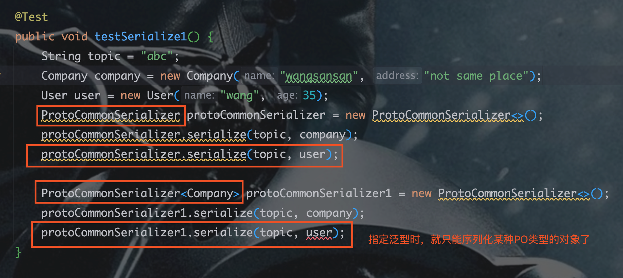 但是这样的优雅其实并没有什么大用,因为为了支持一个序列化工具对象序列化多种类型的对象,实际我们在实例化ProtoCommonSerializer时,根本没法指定泛型