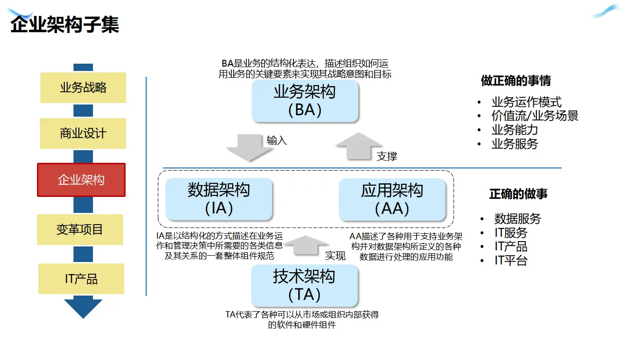 业务架构关注的是组织的业务战略、流程、能力和治理结构。它描述了企业"做什么"以及"为什么做"。