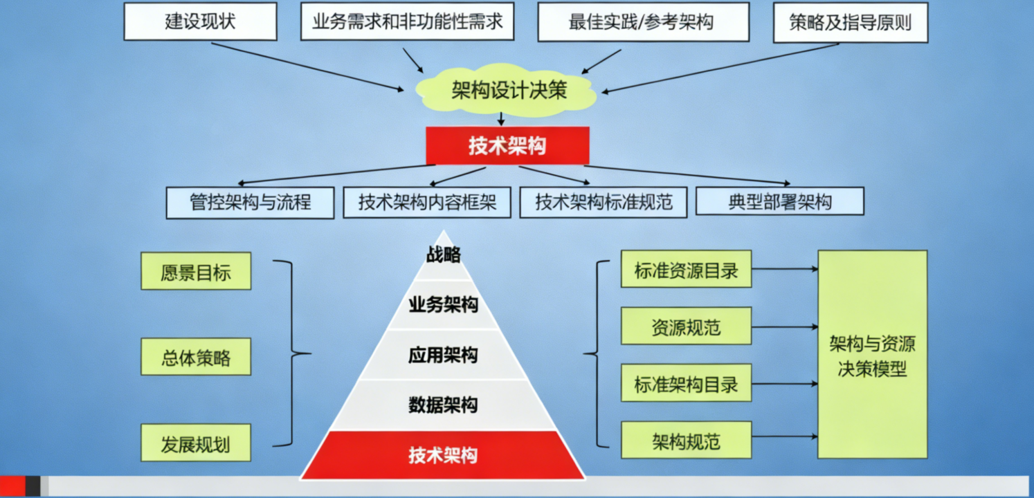 技术架构也称为基础设施架构,描述支撑应用和数据运行的底层技术环境。