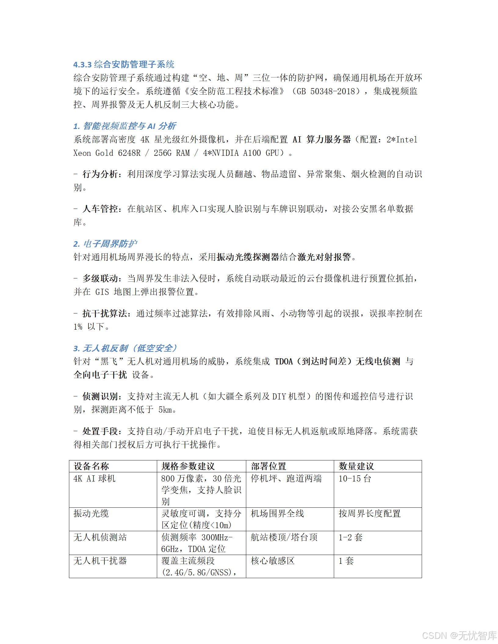 | AI推理服务器 | 2*A100 (80G) GPU / 128G RAM / 2TB SSD | 2台 | 运行AI视频分析等模型 |