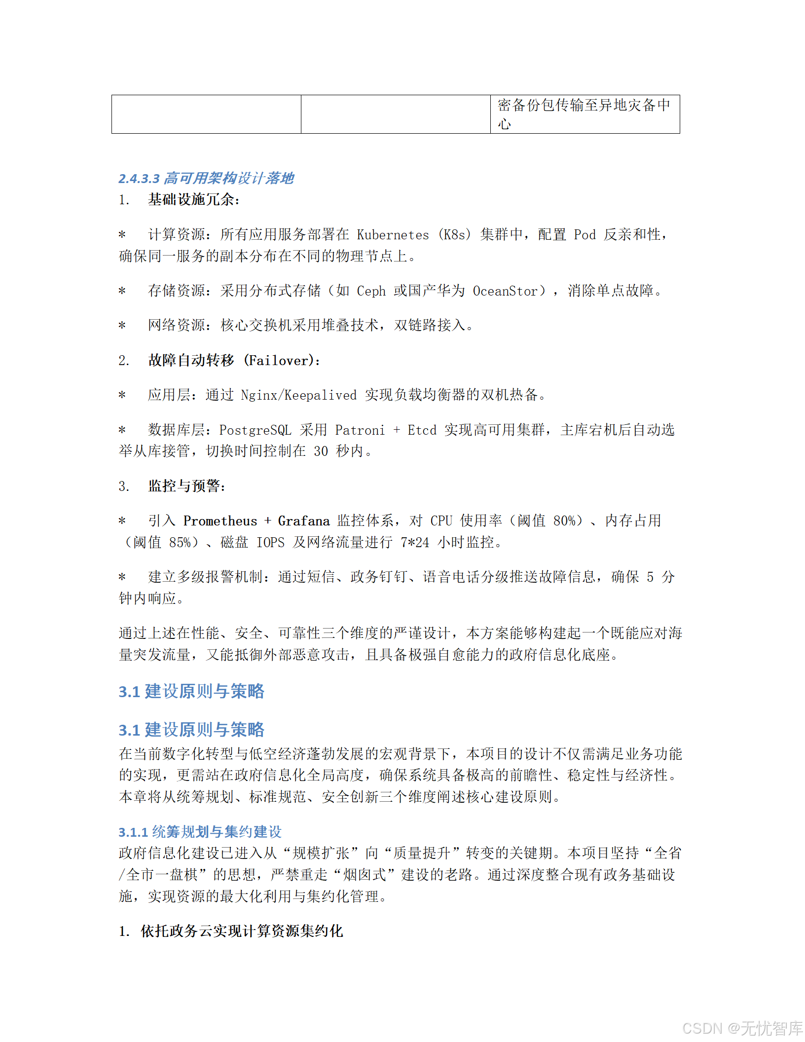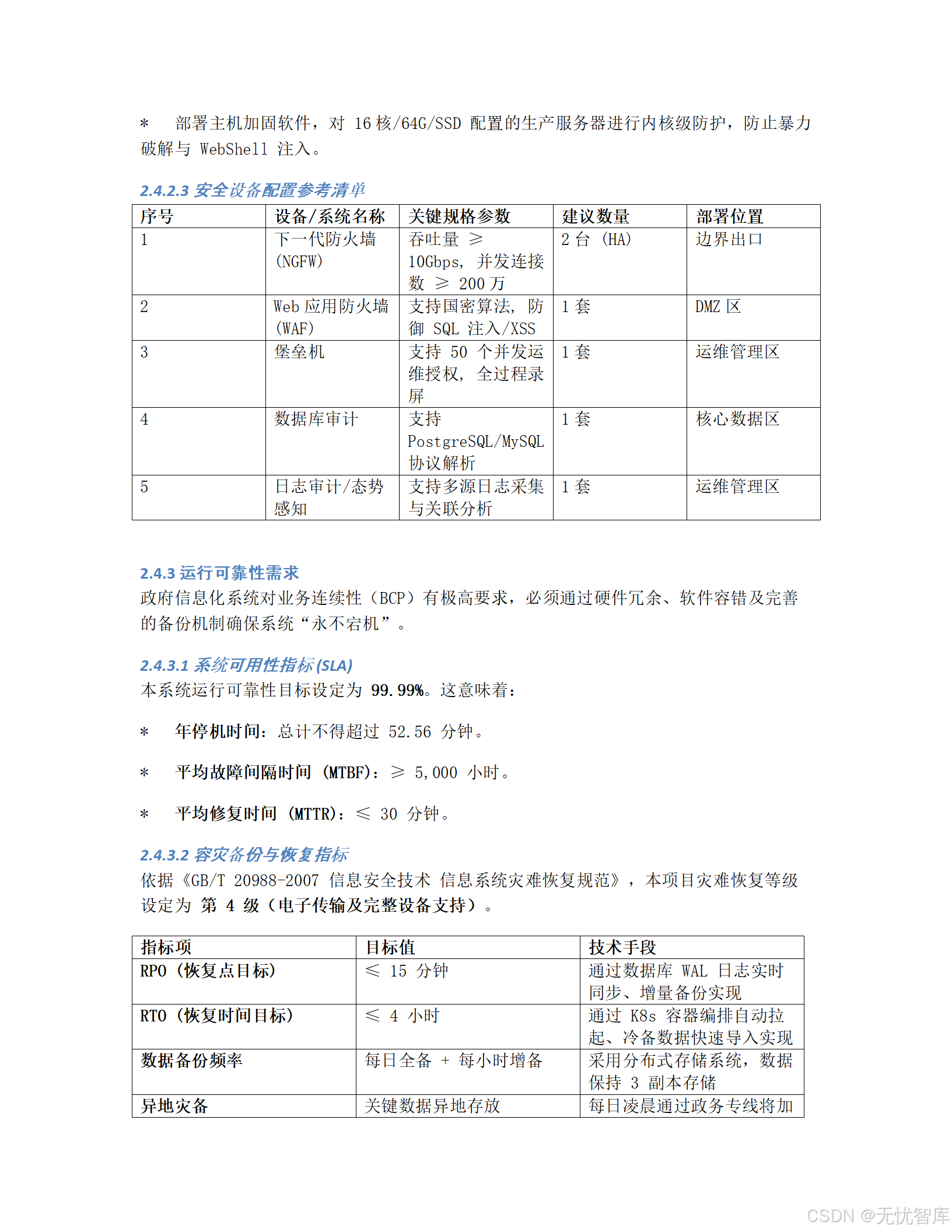 - 恢复指标 :要求 RTO(恢复时间目标)< 30分钟,RPO(恢复点目标)< 5分钟。这意味着即使发生灾难性故障,也能在半小时内恢复服务,且最多只丢失5分钟的数据。这是一个非常高且专业的标准。