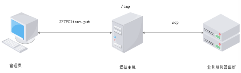 使用 sftp.put()方法上传文件至堡垒机临时目录,再通过send()方法执行scp命令,将堡垒机临时目录下 的文件复制到目标主机。