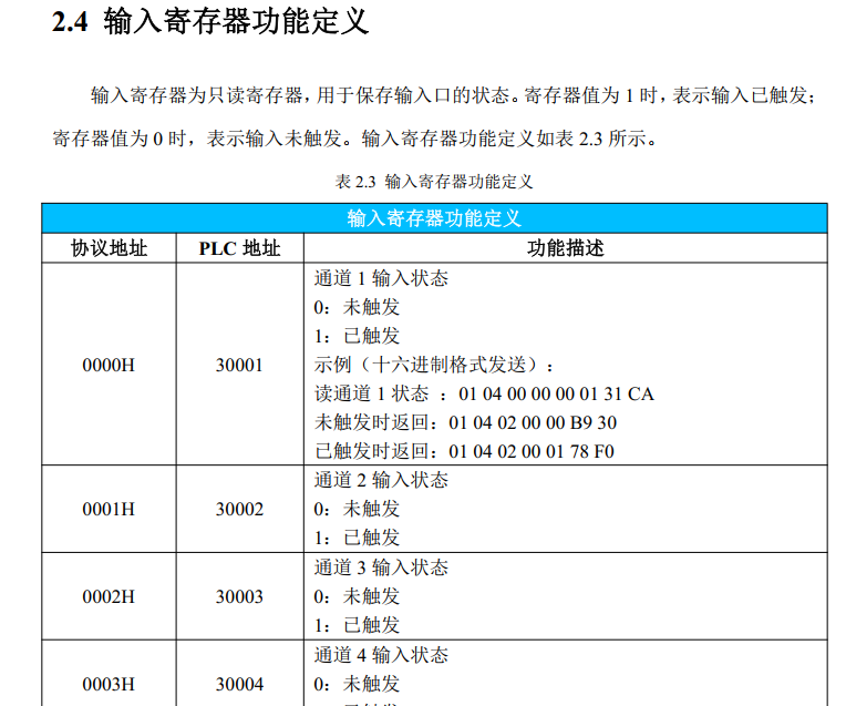 b.仪表地址,本次仪表的寄存器地址如下。 如30001,在上面只需要调用cmd3, Register start address, 数据起始地址为1就可以了。