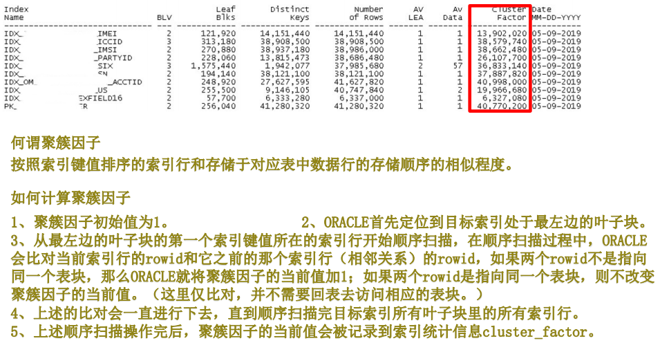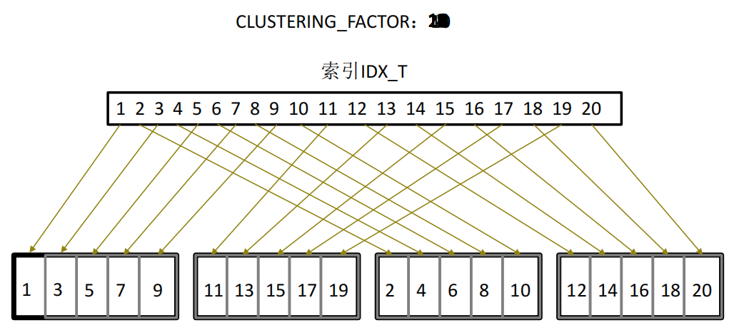 如果聚簇因子的值接近与行的值(20),说明的表的顺序是不好的,这种情况下,同一个叶块的索引项可能没有指向同一个数据块。