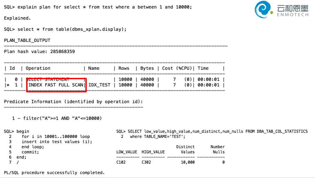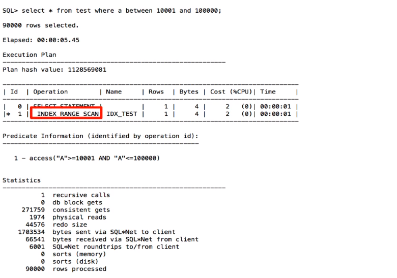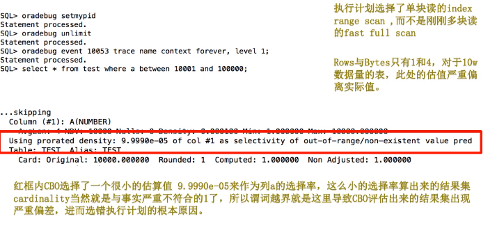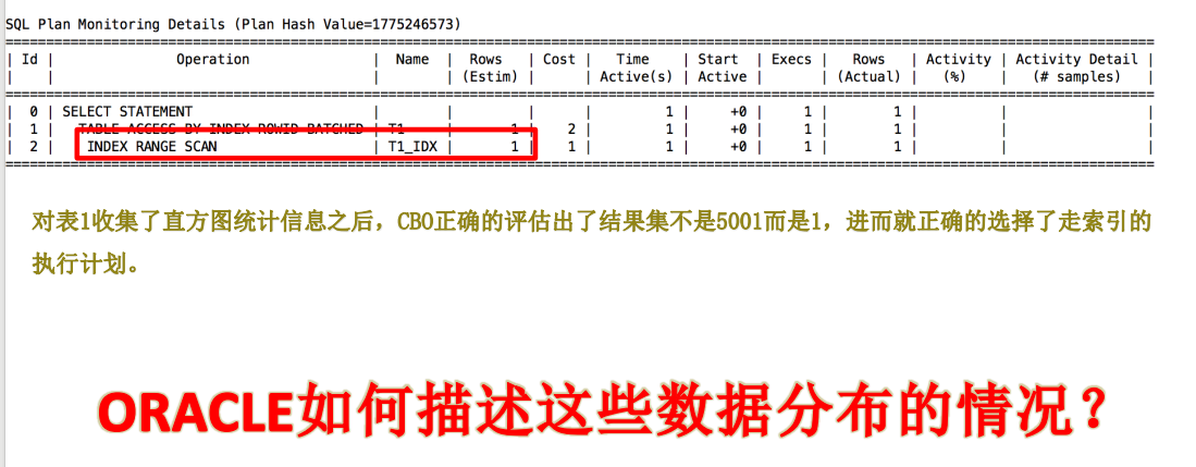 执行计划选择了单块读的index range scan ,并且 Rows和Bytes是1和4 ,对于查询10000条数据,这里的估值存在了很大的偏差