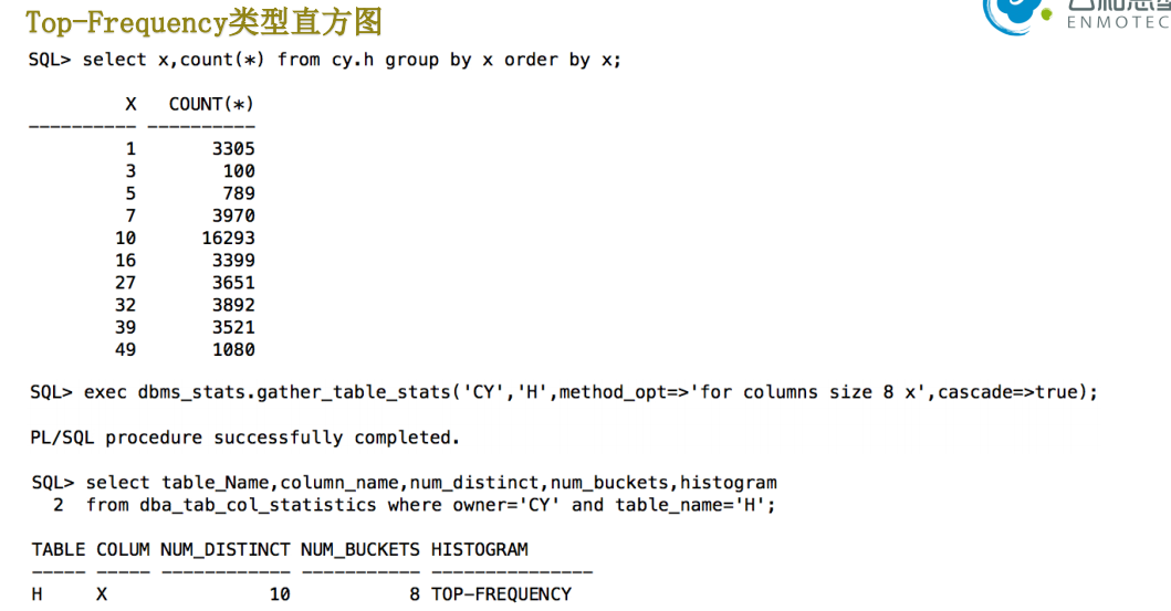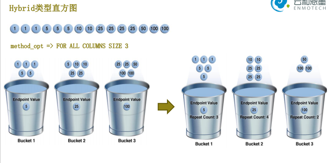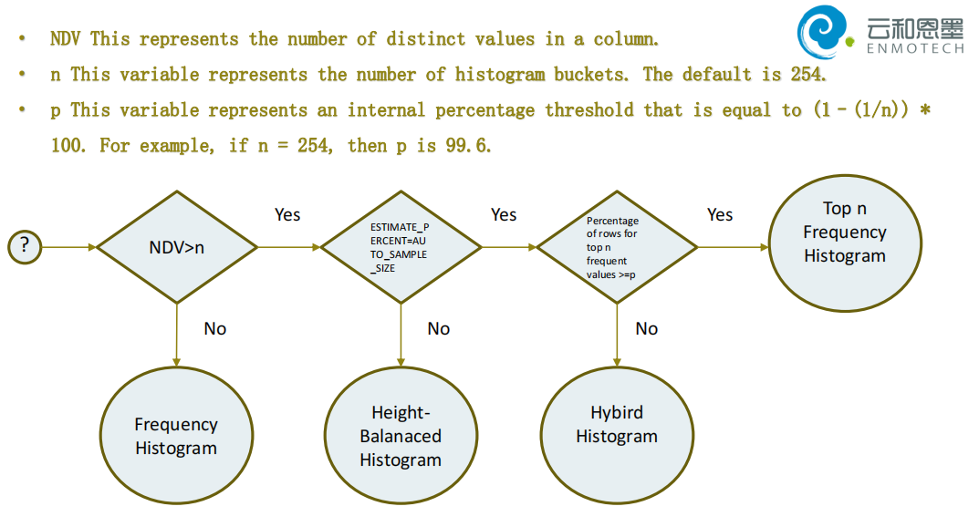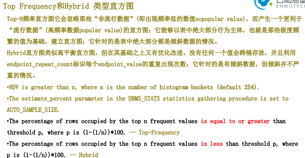 • Hybrid Histogram ---列的NDV>254 但是高频的254个列值占总行数比例小于100-100/n