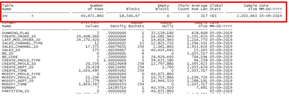 上图的红框用于描述表的详细统计信息,包含了记录数、表块(表里的数据块)的数量、平均行长度等典型