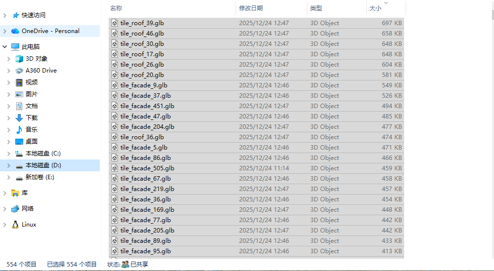 而且对于贴图做了无损压缩,下图这个大概8000多个建筑,带上贴图才50多m。每个glb不到1M