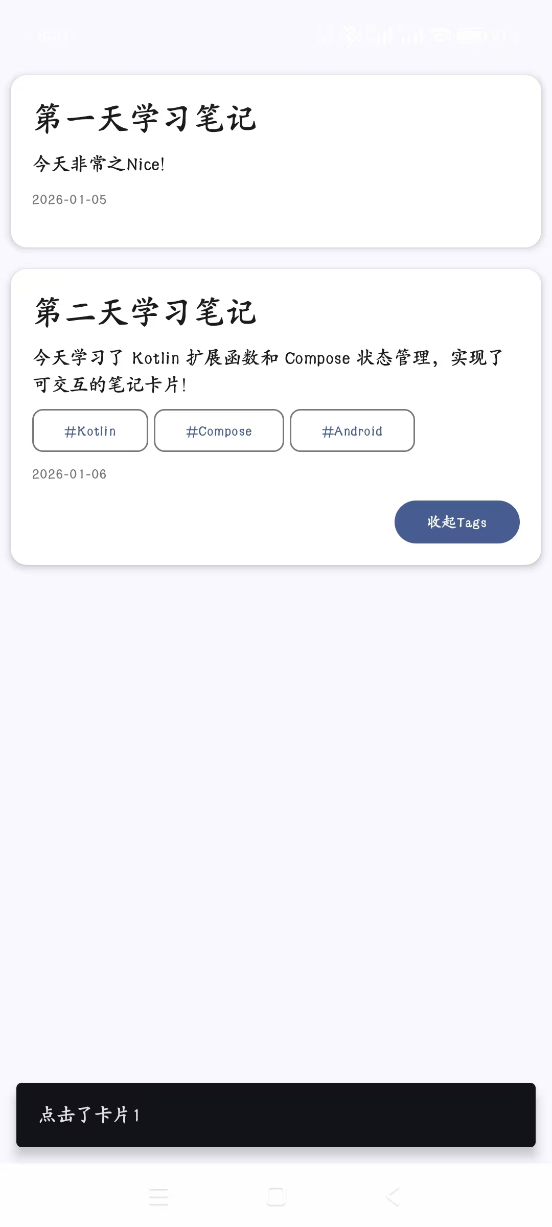 kotlinsetContent { NoteAppTheme() { val snackBarHostState = remember { SnackbarHostState() } val scope = rememberCoroutineScope() Scaffold( snackbarHost = { SnackbarHost(snackBarHostState) } ) { Surface( modifier = Modifier .fillMaxWidth() .systemBarsPadding(), color = MaterialTheme.colorScheme.background, ) { Column( modifier = Modifier .fillMaxWidth() ) { val showMsg = { msg: String -> scope.launch { snackBarHostState.showSnackbar(msg) } Unit } val sampleNote = Note( 1L, "第一天学习笔记", "今天非常之Nice!", "2026-01-05", ) NoteCard(sampleNote, showMsg) val sampleNote2 = Note( 2L, "第二天学习笔记", "今天学习了 Kotlin 扩展函数和 Compose 状态管理,实现了可交互的笔记卡片!", "2026-01-06", listOf("Kotlin", "Compose", "Android") ) NoteCard(sampleNote2, showMsg) } } } } }