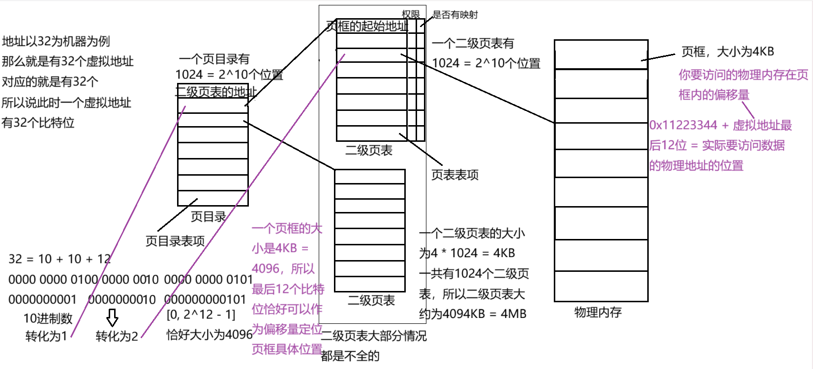 前十位和中间十位对应的可以转化为下标,对应在页目录和二级页表的下标,所以CPU在得到一个虚拟地址要去访问物理地址是,先根据前十位去页目录里面找到对应的二级页表的地址,再根据虚拟地址的中间十位去二级页表中找到页框地址,最后根据最后12偏移量最后找到真实的物理地址。