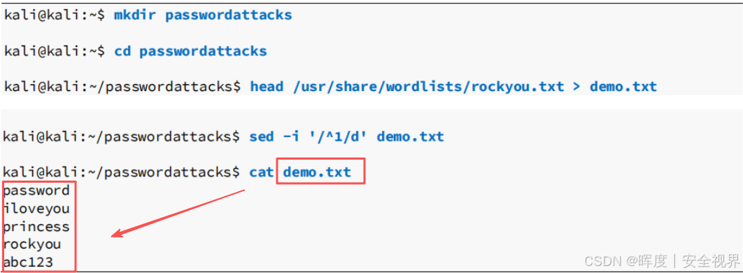 将rockyou.txt的前十个密码复制并保存到新创建的passwordattacks目录下的demo.txt文件中。