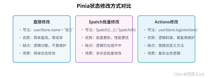 创建 Store 后,需在组件中访问和修改状态,Pinia 提供三种常用方式,各有适用场景: