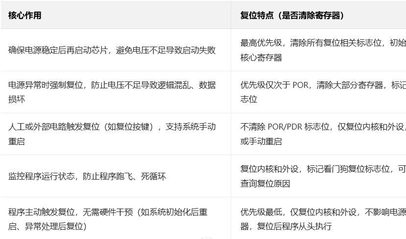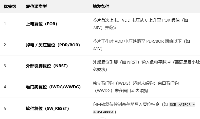 - 优先级核心逻辑 :电源相关复位(POR/PDR)> 硬件复位(外部引脚)> 监控复位(看门狗)> 软件复位。原因是电源复位直接关系芯片的基础运行条件,优先级必须最高;软件复位是程序层面的操作,优先级最低。