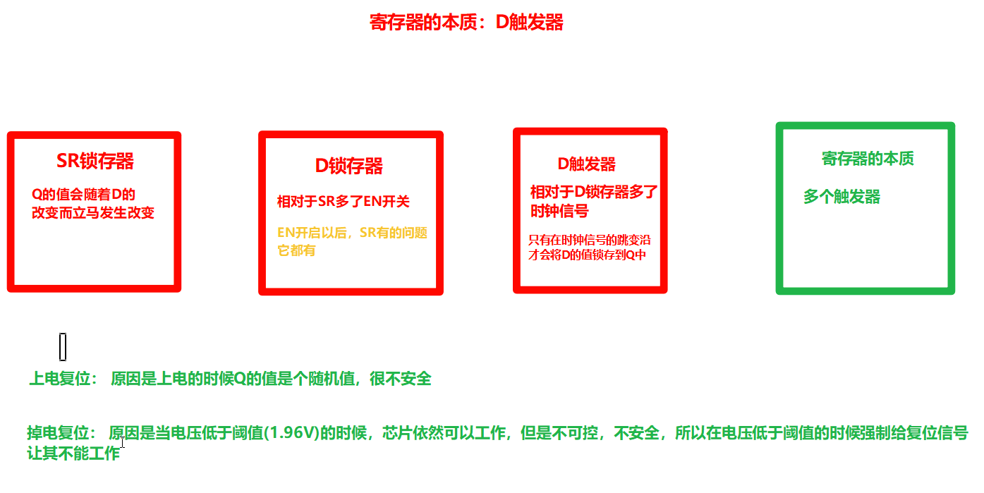 因为LED运行过程中需要清屏会出现上电复位和下电复位的概念,所以现在详细介绍下这两个概念,多少位寄存器就是多少个触发器。