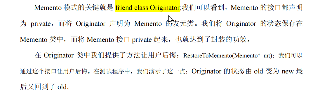 //这里最关键的地方,将originator 为 friend类, 可以访问内部信息,但是其他类不能访问