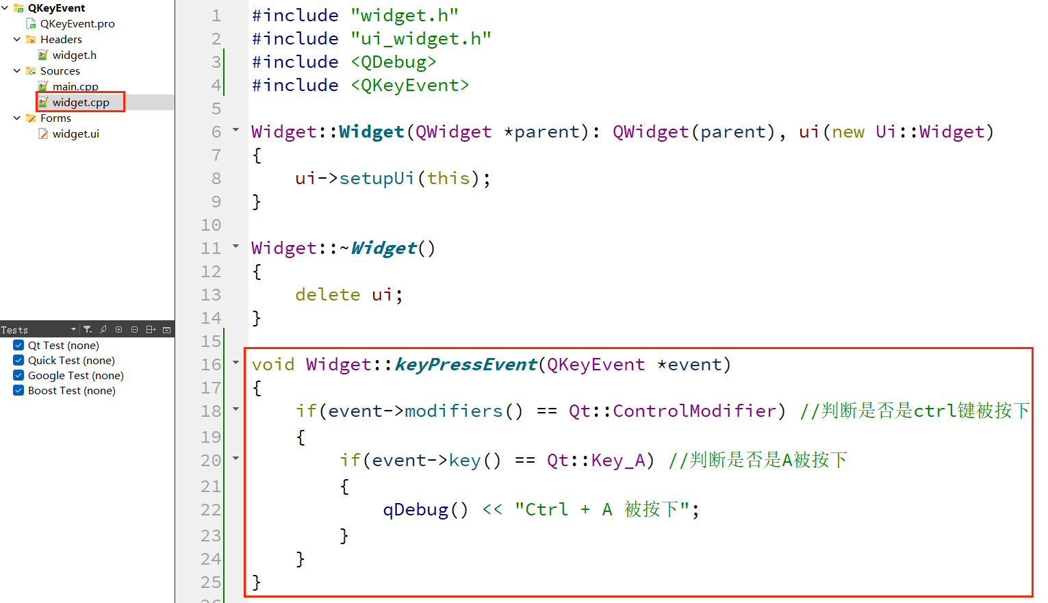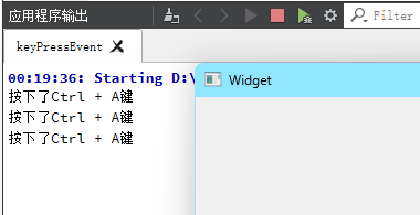 组合按键(如 Ctrl+A、Shift+B)是实际开发中常用的功能,下面实现 "按下 Ctrl+A 时输出提示信息" 的功能,修改keyPressEvent函数如下: