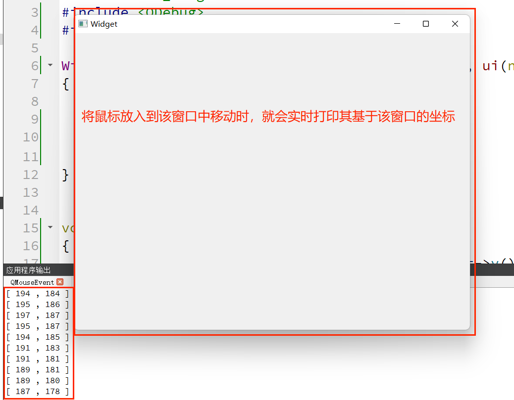 运行程序后,将鼠标移动到窗口中,应用程序输出面板会同步输出鼠标位置的坐标值。