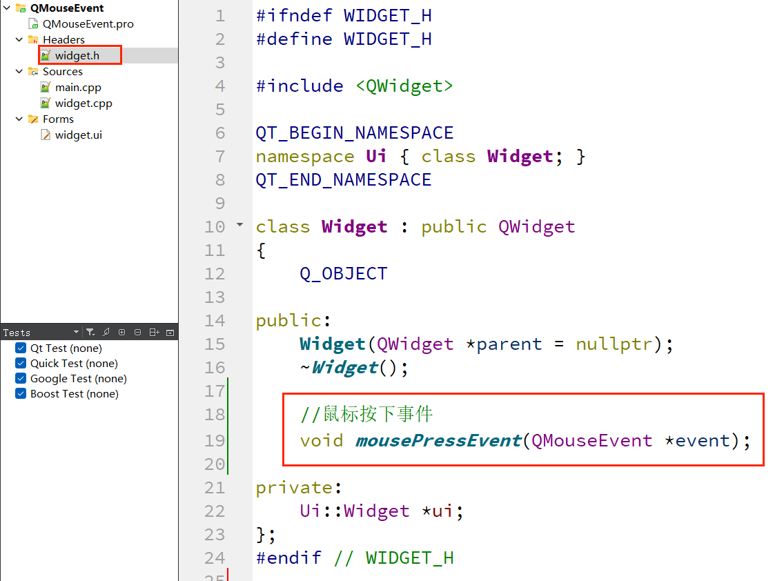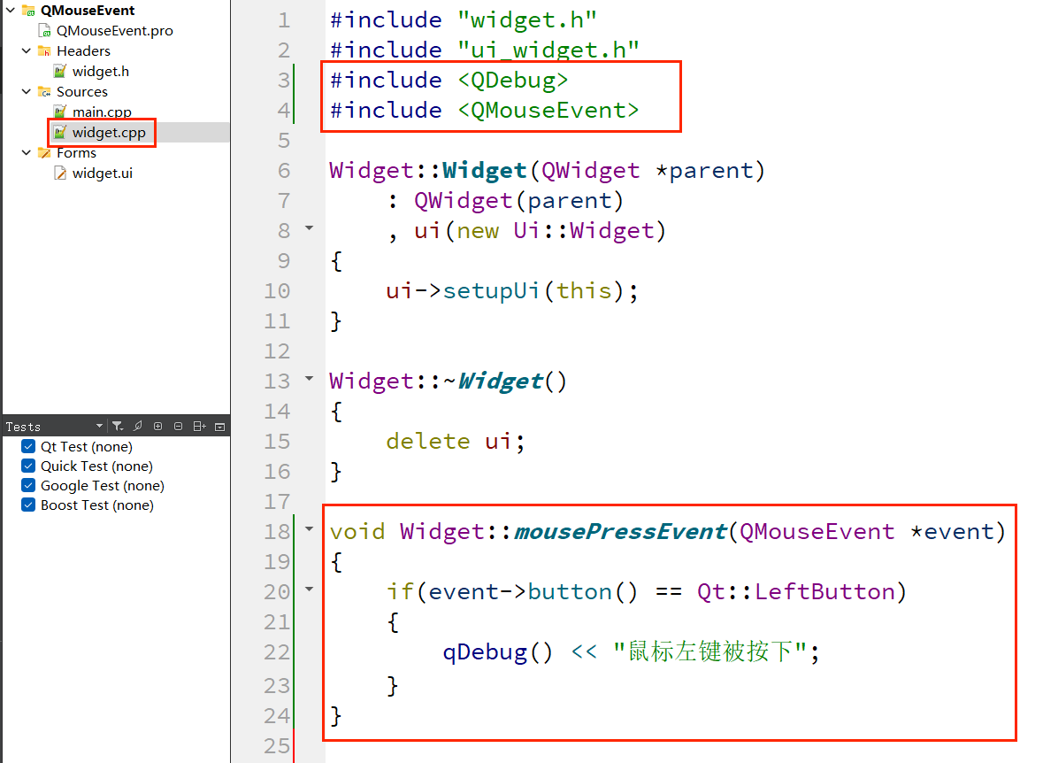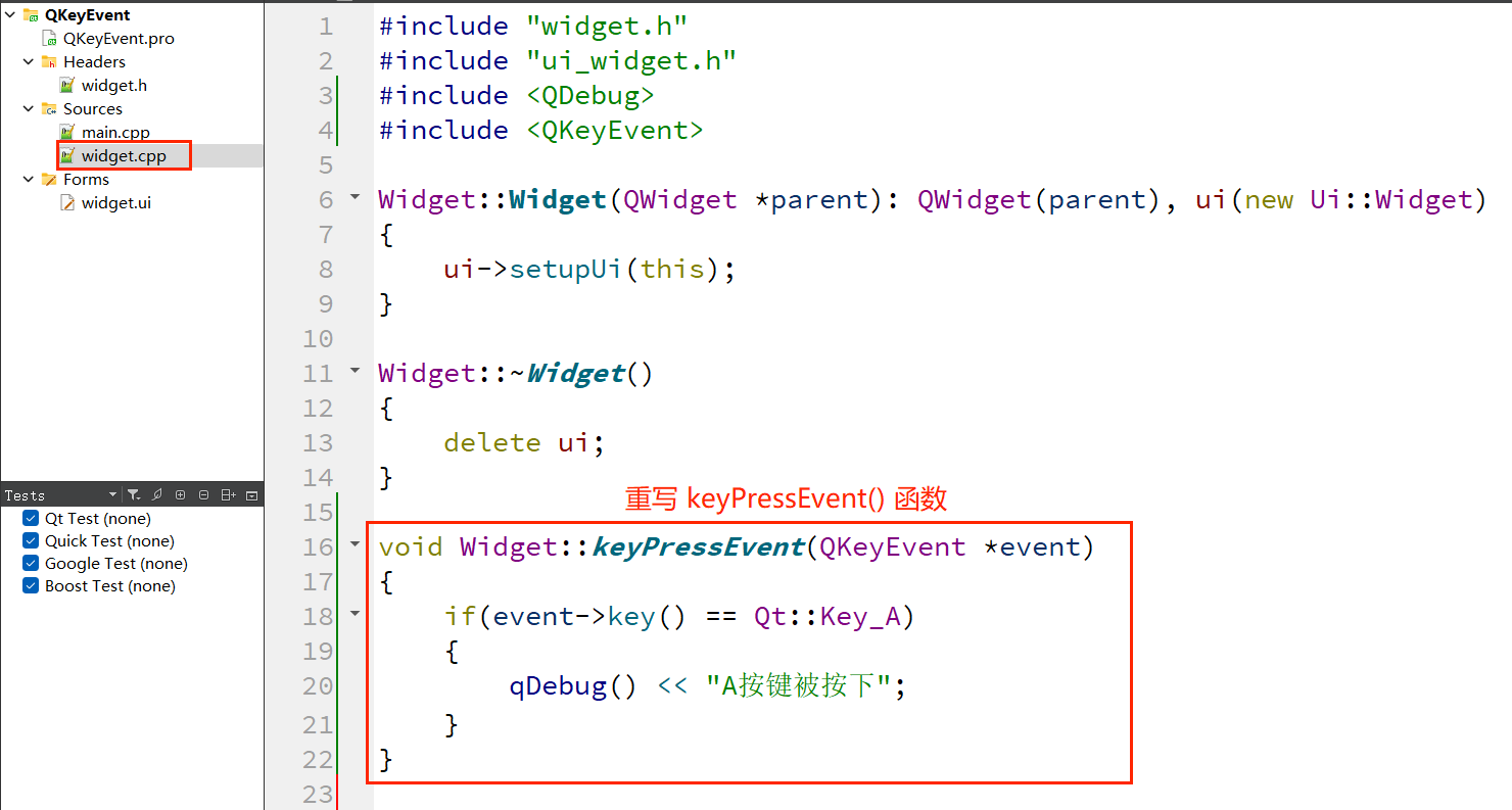 步骤 3:在源文件(widget.cpp)中重写事件函数