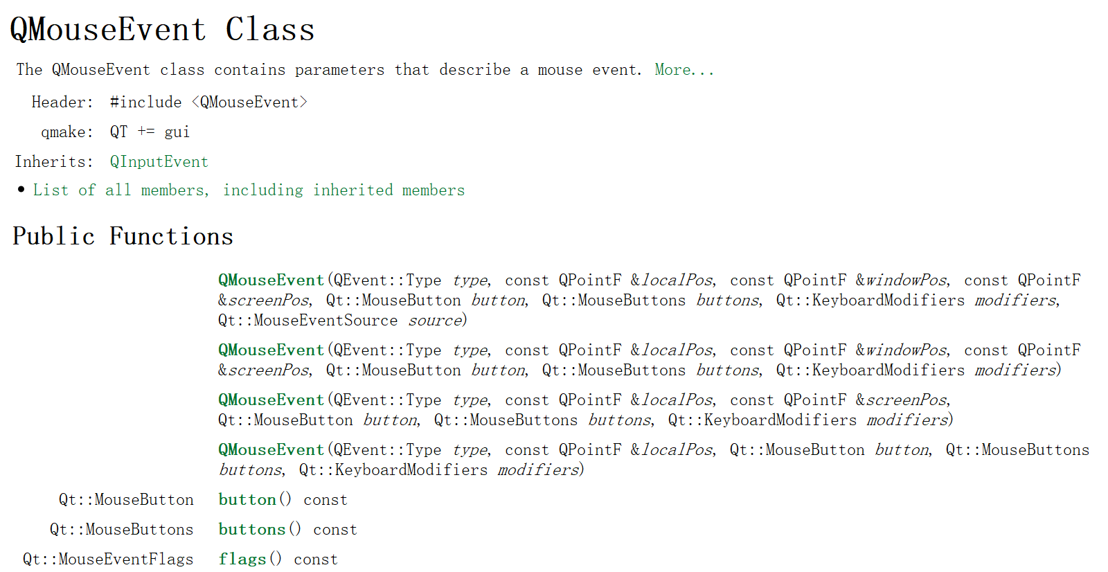 Qt 提供了一系列用于处理鼠标事件的虚函数,定义在QWidget类中,常用如下: