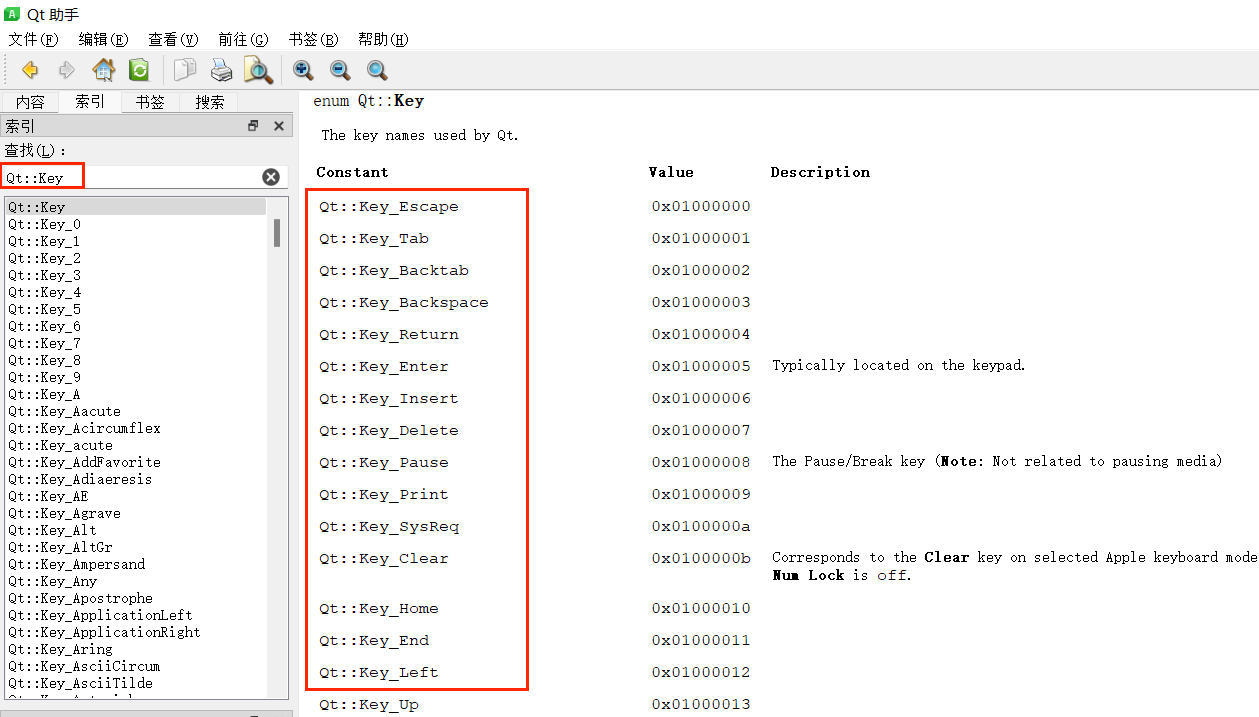 完整的按键枚举值可在 Qt 助手(Qt Assistant)中搜索**Qt::Key**查看。