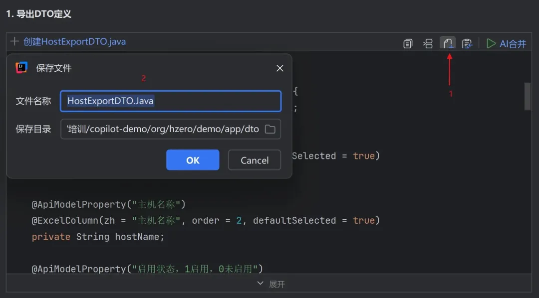 支持在对话结果中将代码块直接保存为本地文件,快速完成代码落地与工程接入,提供如下两种创建方式: