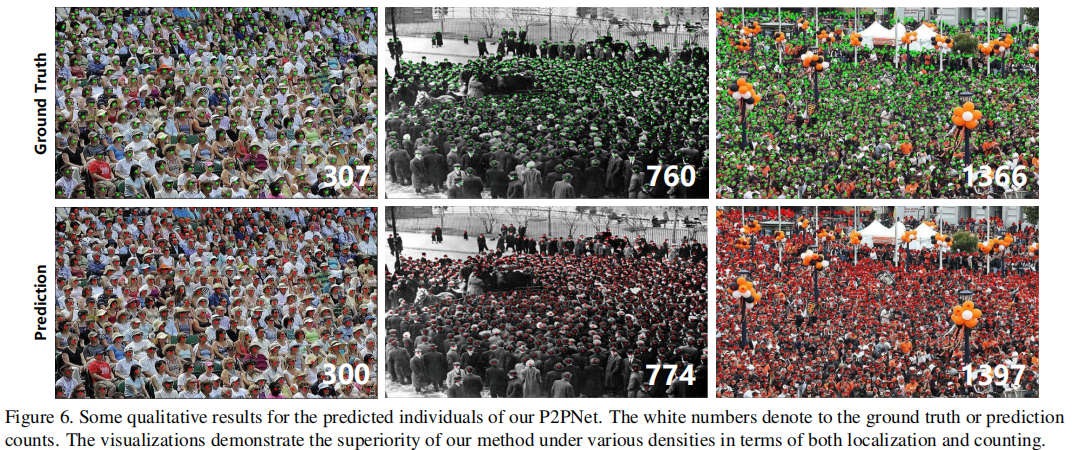 (注:白色数字为真实计数 / 预测计数,红色点为预测点,绿色点为真实点。P2PNet 在稀疏、中等、高密度场景下均能精准匹配真实点,计数误差小。)