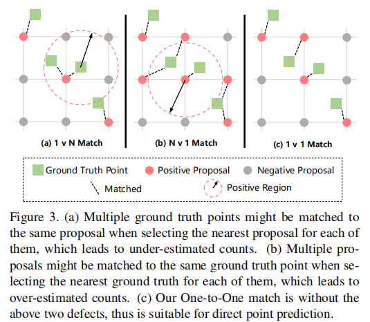 (注:绿色为真实点,红色为正样本预测点,灰色为负样本预测点。一对一匹配避免了高估 / 低估问题。)