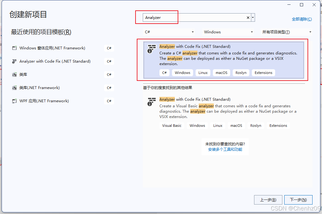 打开Visual Studio创建规则分析器,通过搜索Analyzer找到项目模板。