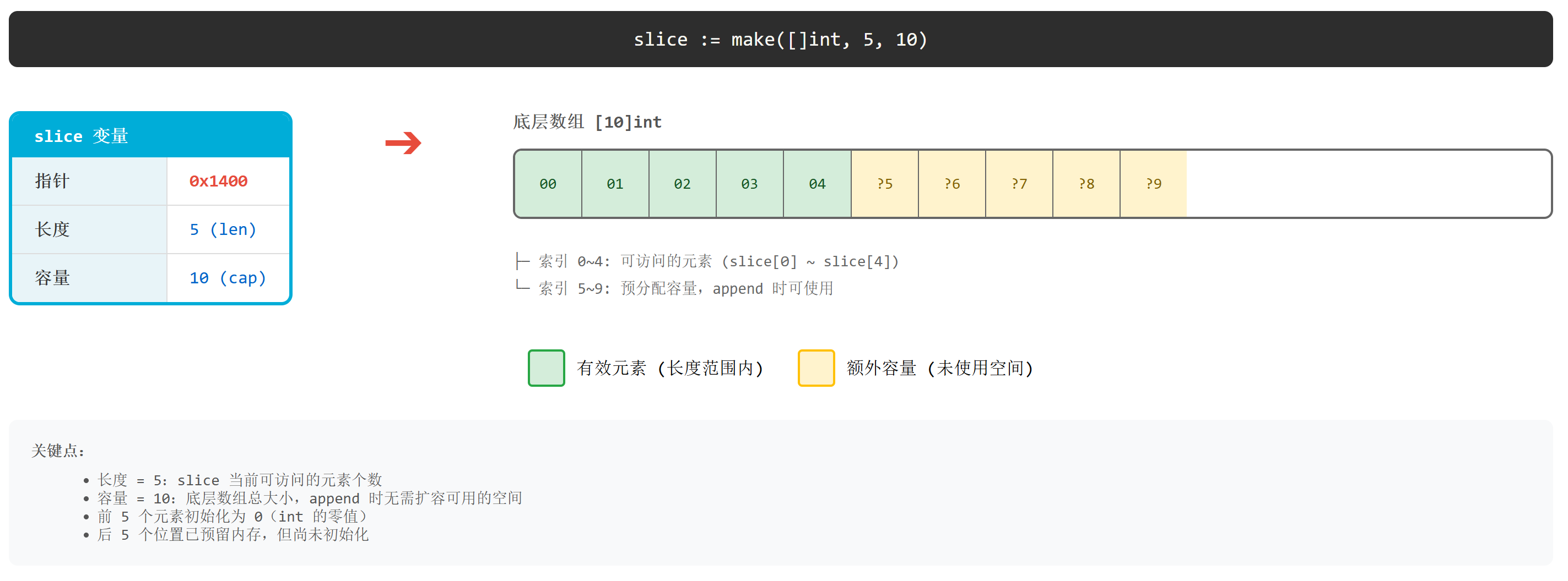 如下图所示,使用 make([]int, 5, 10) 创建 slice 的底层结构: