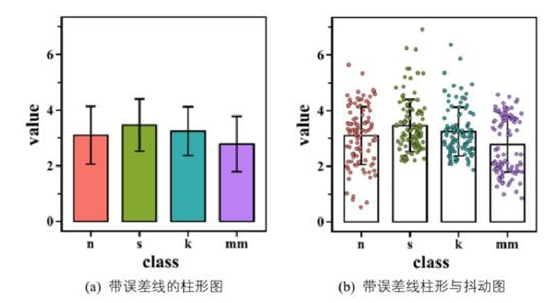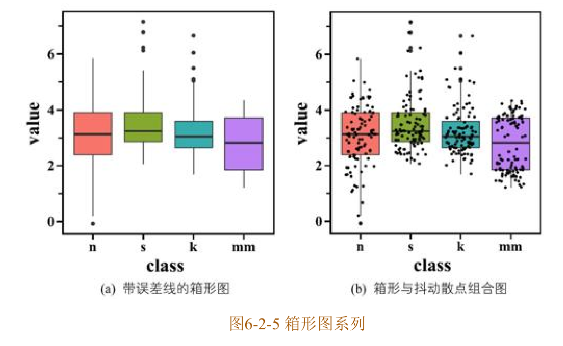单纯的柱形图能表达的信息有限,可以结合例如数据的误差分布,丰富图像的表达效果,进一步地产生以下箱型图系列。
