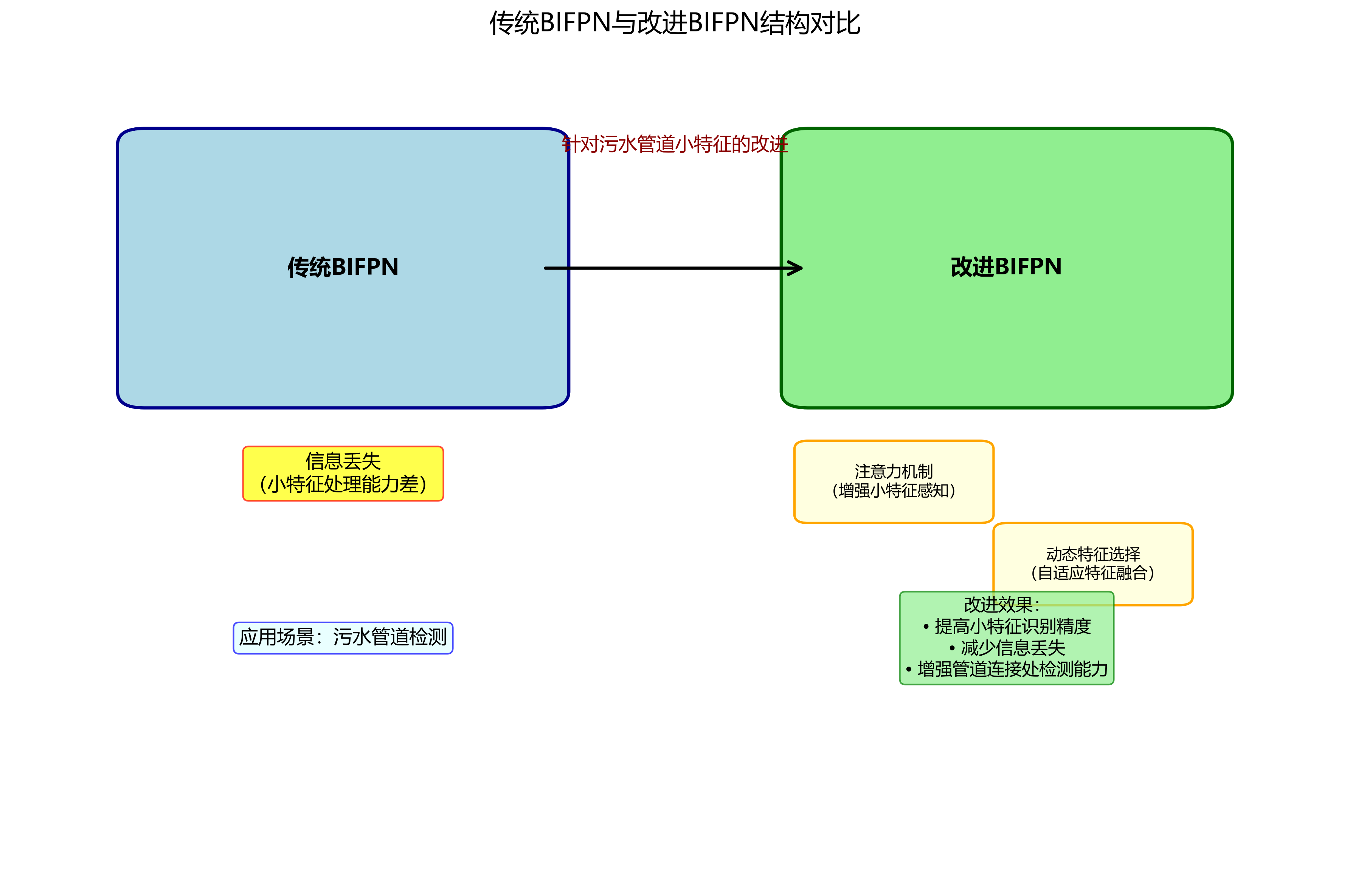 传统BIFPN在处理大尺度目标时表现良好,但在处理污水管道中的小特征(如管道连接处的细微差异)时,信息丢失较为严重。为了解决这个问题,我们提出了一种改进的BIFPN结构,引入了注意力机制和动态特征选择策略。