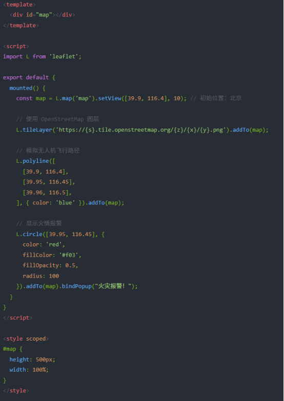 前端部分通过 Vue.js 和 Leaflet 显示地图、无人机飞行路径、火情报警等。