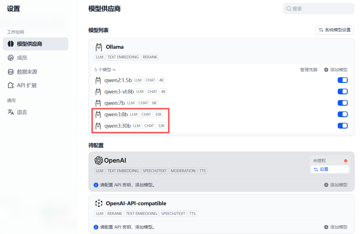 Dify中配置的模型如下