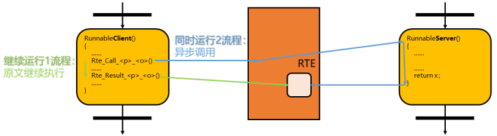 - 事件触发,当被调函数运行结束,RTE 可以触发原函数,告诉它被调函数运行完了,你可以读取返回值了。